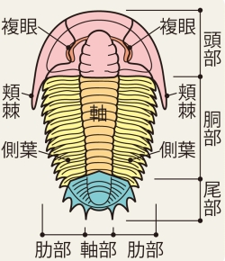 三葉虫は体の真ん中(中軸)と横腹の側葉が合わせて3つあることから、その名前がつきました。頭部と胴部、尾部に分かれていて、頭部に複眼があります。西予市で見つかったエンクリヌルス属はイチゴのようにごつごつした頭で、尾部にとげのような突起があるのが特徴です。