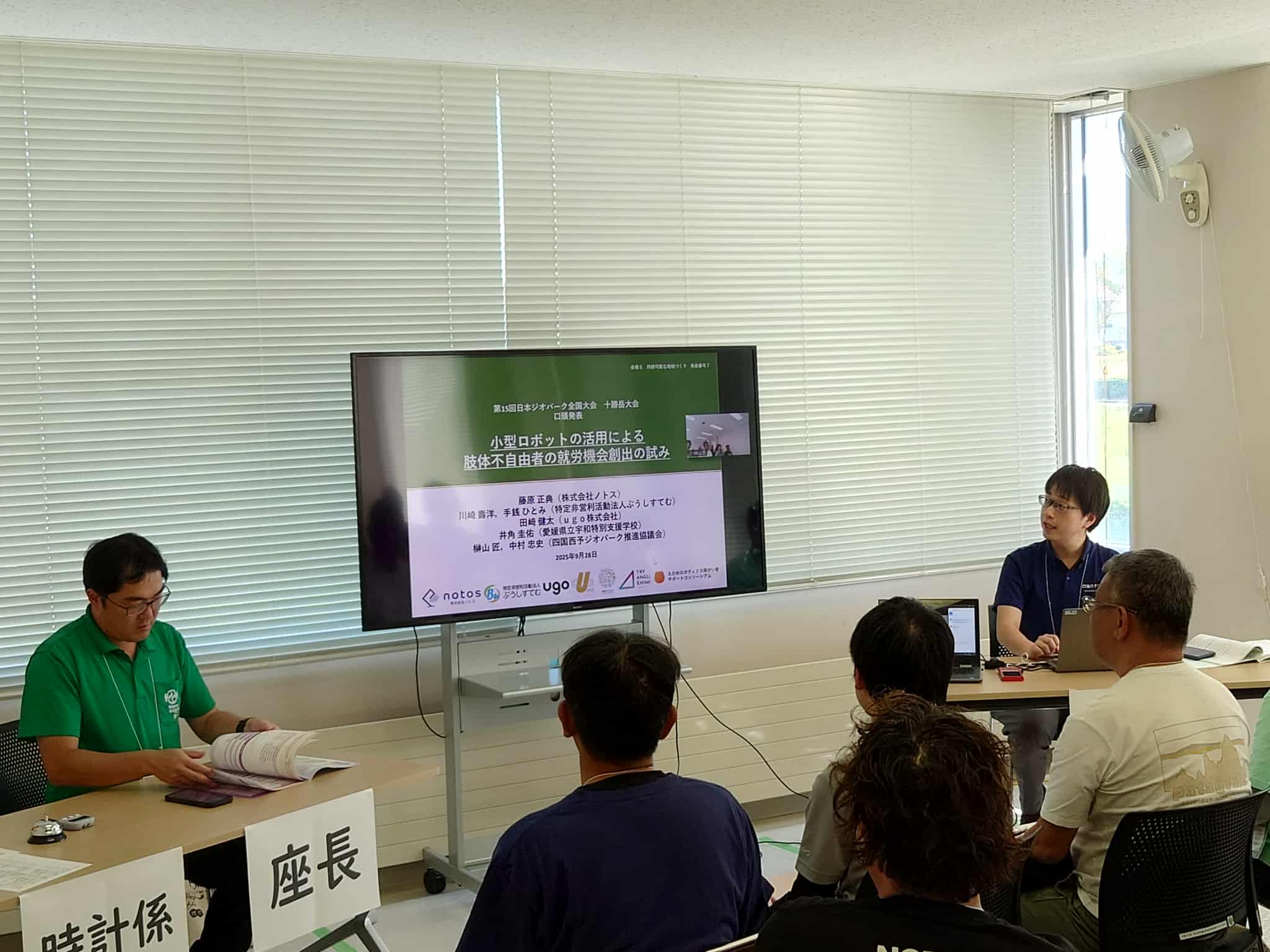 口頭発表:藤原 正典(株式会社ノトス),川崎 壽洋,手銭 ひとみ(特定非営利活動法人ぶうしすてむ), 田﨑 健太(ugo株式会社),井角 圭佑(愛媛県立宇和特別支援学校), 榊山 匠,中村 忠史(四国西予ジオパーク推進協議会)「小型ロボットの活用による肢体不自由者の就労機会創出の試み」