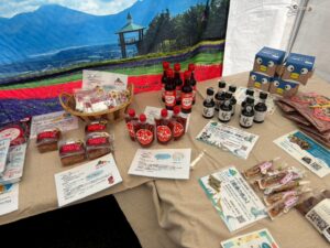 大会期間中、会場内では「丘と彩りのふれあいマルシェ」が実施されました。十勝岳ジオパークのご当地産品の販売や体験コーナーが並んだほか、各地のジオパークの認定商品の販売ブースも用意されました。四国西予ジオパークからは、遊子川ザ・リコピンズの「こどもケチャップ」と「トマトユズポン」が販売されました。