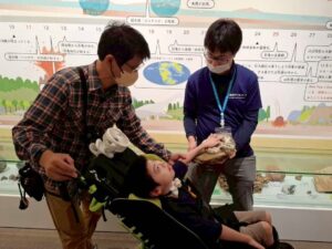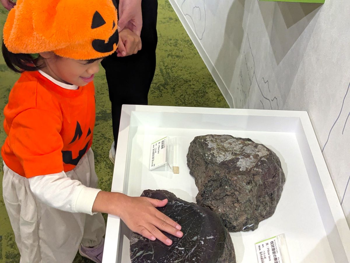 展示室内の地図や写真を一緒に眺めたり、岩石や化石の露出展示を一緒に触ったりして、西予に多様な自然や文化が残っていることを体感してもらいました。