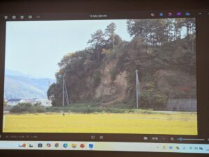 続いて岡崎さまから西予市に残る戦時遺産の紹介がありました。宇和盆地が広がる宇和町永長にはかつて、大戦の末期に建設された陸軍の飛行場があったそうです。本土決戦の備えた特攻用の飛行場で、GHQが1948年に撮影した航空写真からは約1km超の長さの滑走路があったことが分かります。当時はアスファルトのような資材もなく、限られた物資を用いて突貫工事で仕上げられたようです。現在は圃場整備もされて当時の様子は全く残っていませんが、永長の常居寺の西側に見える大きくえぐられたチャートの崖は、当時飛行場を建設するための石を切り出した跡であると伝えられています。