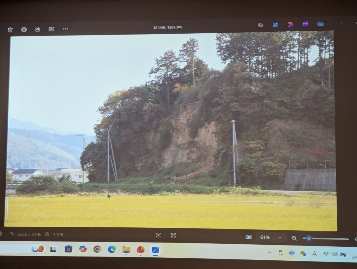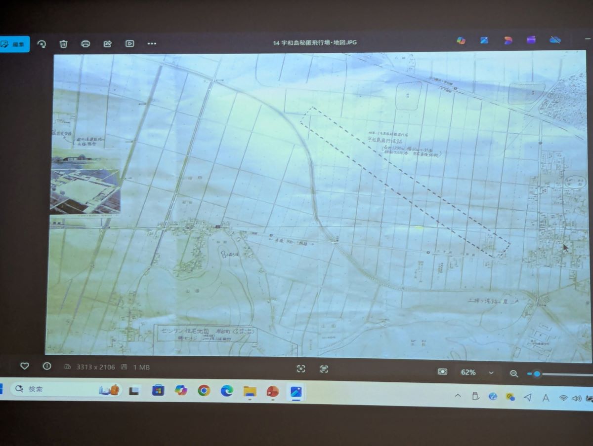 続いて岡崎さまから西予市に残る戦時遺産の紹介がありました。宇和盆地が広がる宇和町永長にはかつて、大戦の末期に建設された陸軍の飛行場があったそうです。本土決戦の備えた特攻用の飛行場で、GHQが1948年に撮影した航空写真からは約1km超の長さの滑走路があったことが分かります。当時はアスファルトのような資材もなく、限られた物資を用いて突貫工事で仕上げられたようです。現在は圃場整備もされて当時の様子は全く残っていませんが、永長の常居寺の西側に見える大きくえぐられたチャートの崖は、当時飛行場を建設するための石を切り出した跡であると伝えられています。