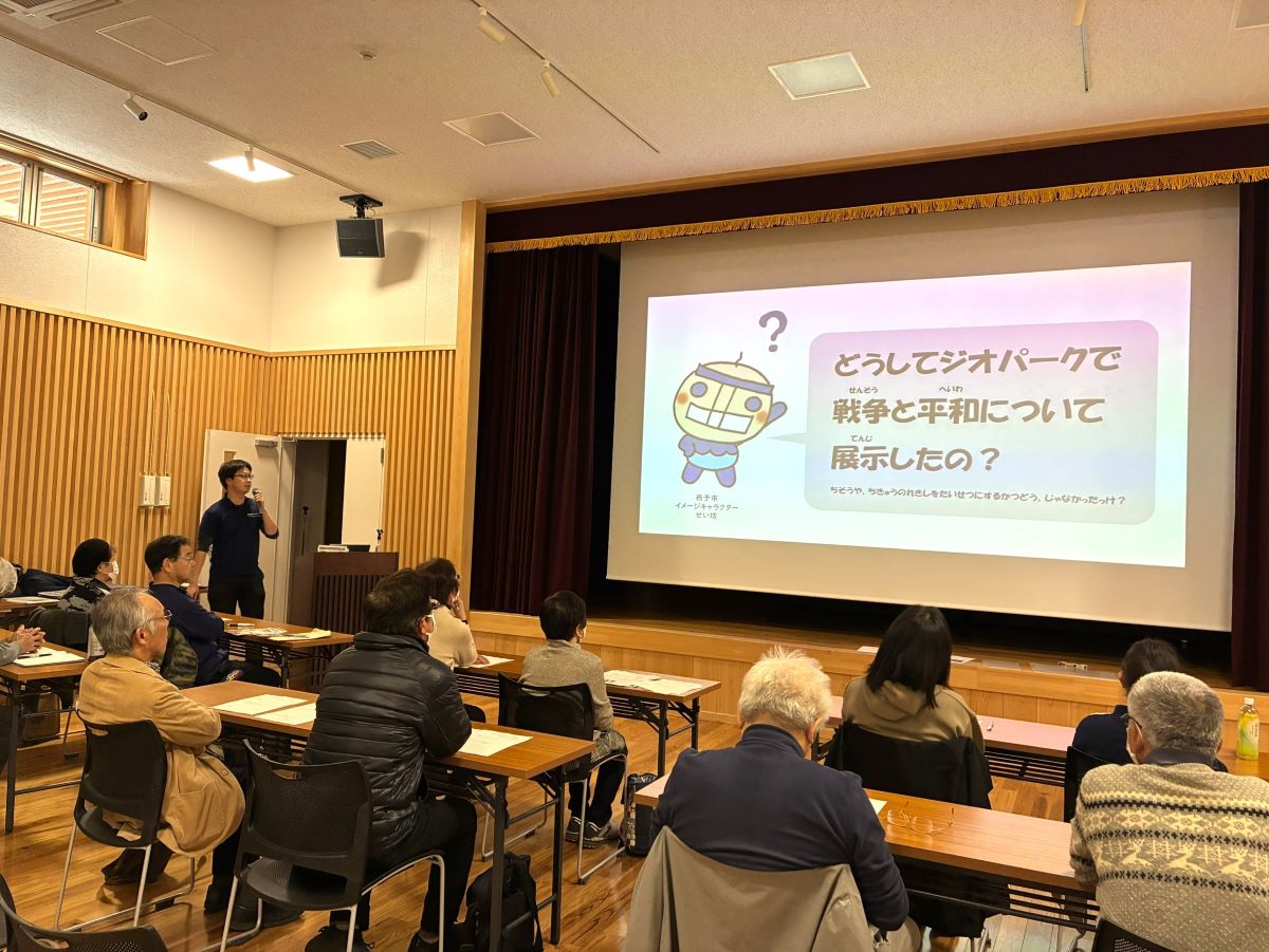 はじめに四国西予ジオミュージアムの榊山さんから「ジオパークでどうして戦時遺産や平和学習を取り上げるのか?」について説明がありました。ジオパークの活動は、大地の成り立ちと人の暮らしの関わりを紹介することが主な活動と思われがちです。ジオパークの活動指針を定めているユネスコは、その憲章の前文で「人の心の中に平和のとりでを築かなければならない」と謳っているように、第二次世界大戦の反省として教育や文化の保護、科学の振興を行うことで、人々の偏見を減らして戦争の抑止につなげることを活動目的としています。ジオパークの取り組みもユネスコがめざす平和の実現につながっていることから、今回の展示を実施したということです。