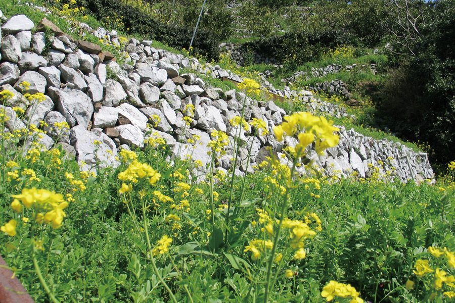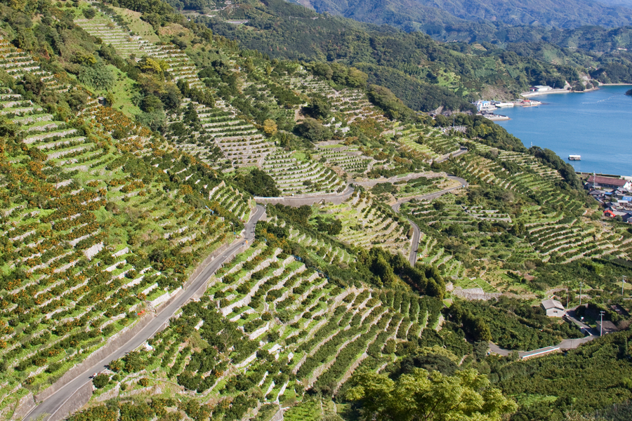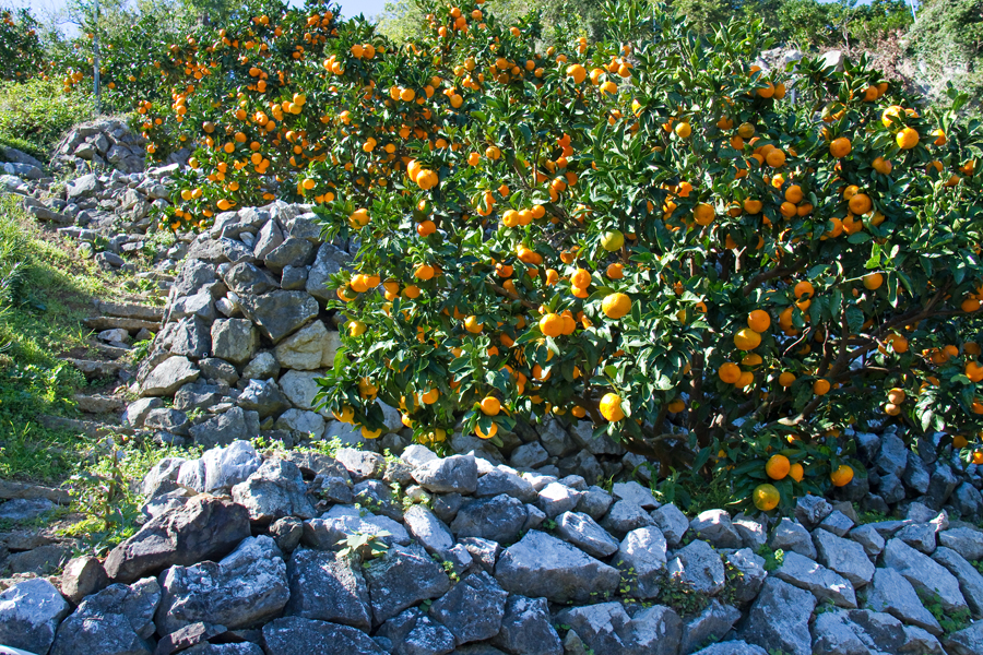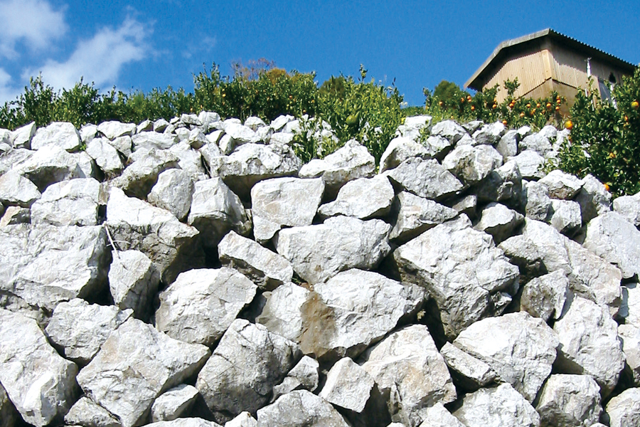 宇和海沿岸に点在する段畑は、身近にある岩石を利用して積み上げられるため、地域によって違う岩石が使われています。この狩浜の段畑の石積みの多くは石灰岩によるもの。春には菜の花が、秋にはミカンが色づき、青い空、石灰岩とのコントラストは絶景です。