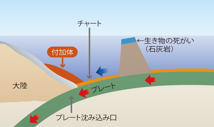 この石灰岩は、かつて南の暖かな浅い海に生息していたプランクトンなどの生き物の死がいが、プレートの動きによって大陸にぶつかり、付加体として成長したものです。