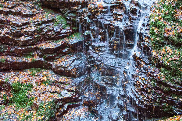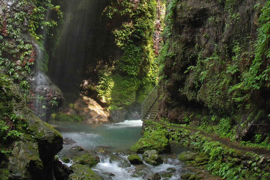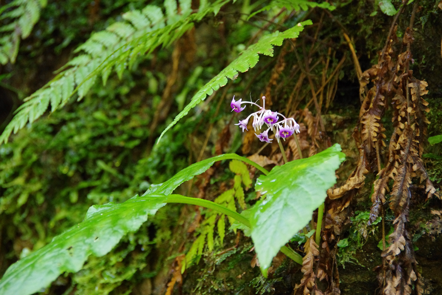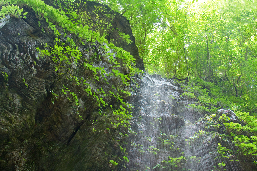 シダやコケが生える深い緑の中に、澄み切った清流が流れる桂川渓谷。基盤岩はチャート、砂岩、泥岩で、川の侵食作用に耐えたチャートが切り立った谷をつくっています。遊歩道沿いに滝や淵が連続して見られ、夏でも涼しさを感じられます。